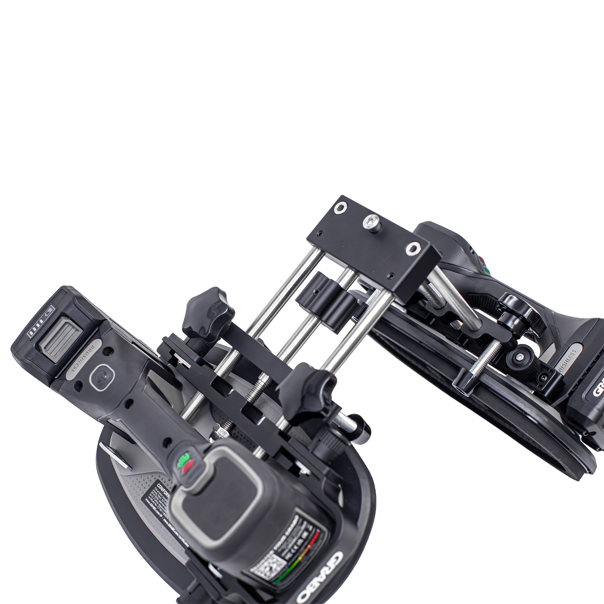 Designed specifically for GRABO tools, the unit features spring-loaded quick-lock pins that connect directly to the GRABO’s metal anchor points, allowing for fast setup and a secure attachment without complicated hardware. Once mounted, the four-point leveling system gives installers fine control over surface alignment, making it easy to bring both materials perfectly flush at the corner.