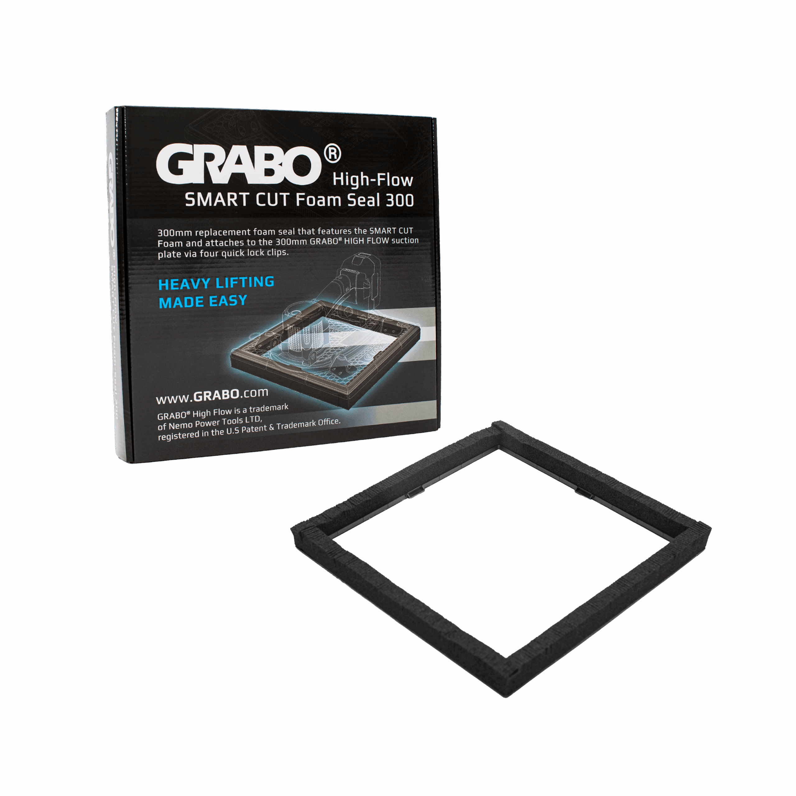 The GRABO Smart Foam Seal 300, the essential accessory for your GRABO HIGH FLOW. Specifically made for the 300mm (12"×12") GRABO HIGH FLOW Suction Plate, foam seals are interchangeable and securely attach via the four spring-lock pins and offer a reliable holding capacity of up to 150 lbs (68 kg). Featuring strategically engineered cuts throughout the gasket, it effortlessly conforms to extremely textured and porous pavers. Ideal for landscaping, hardscaping construction professionals.