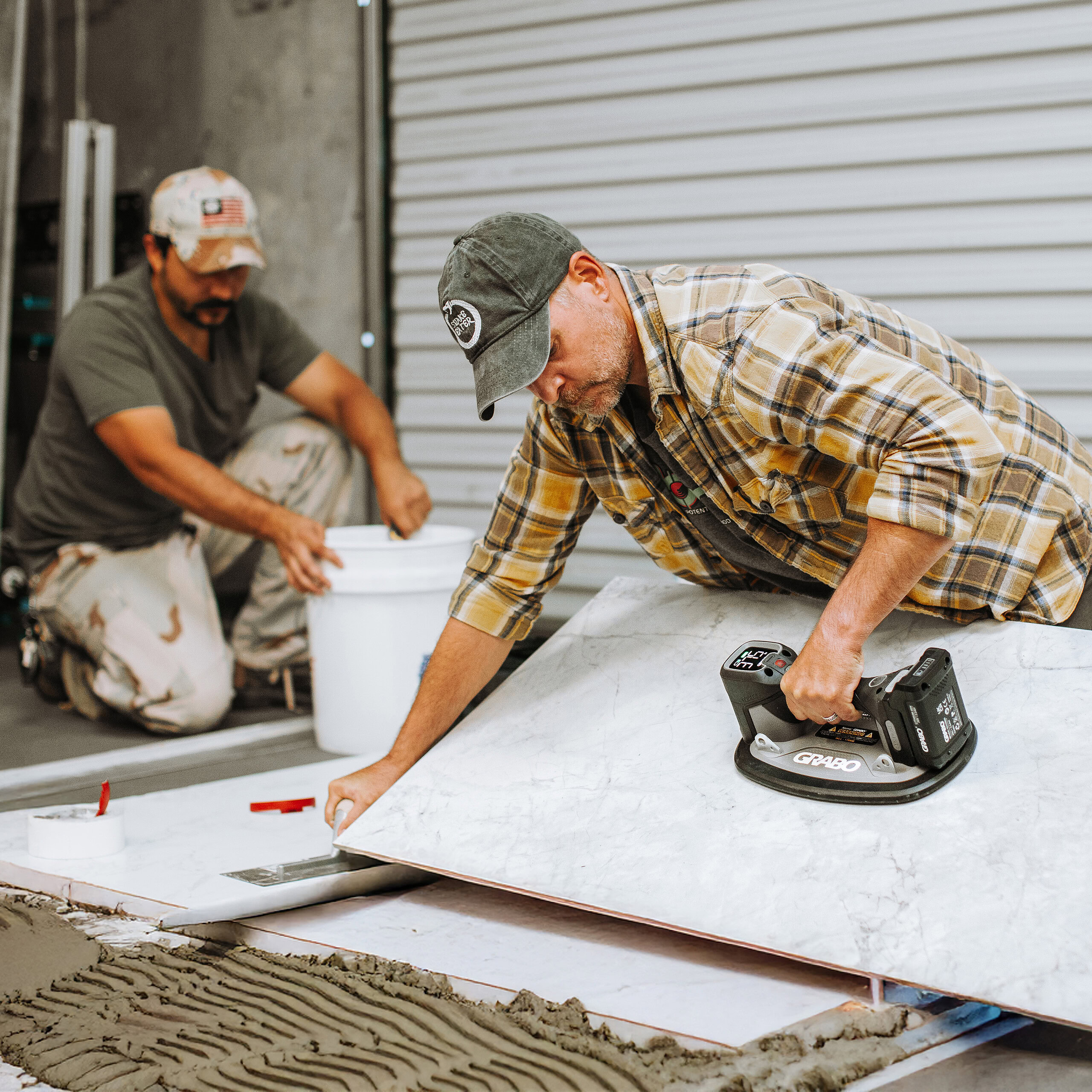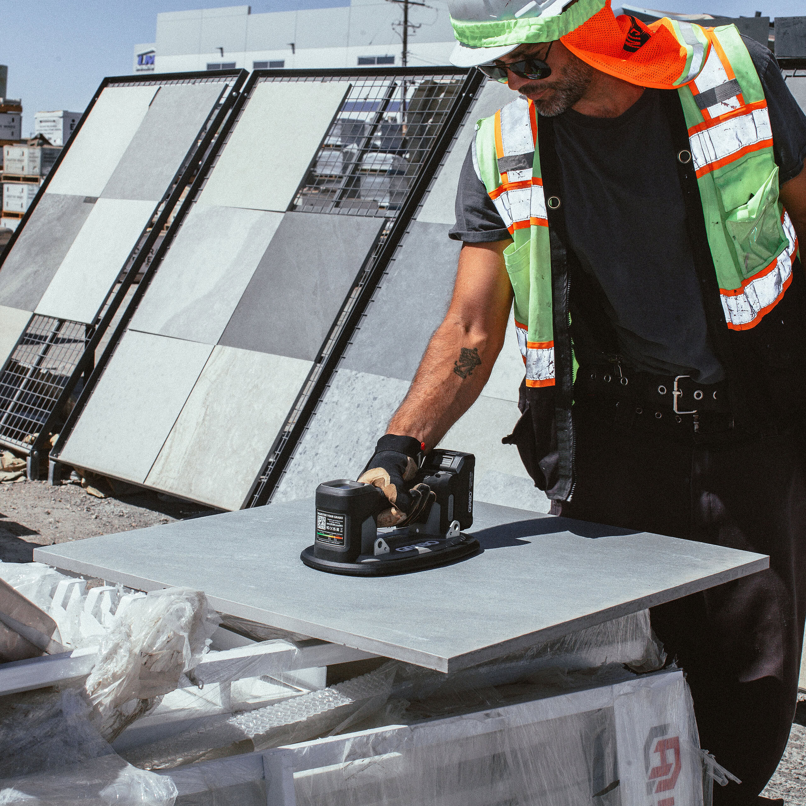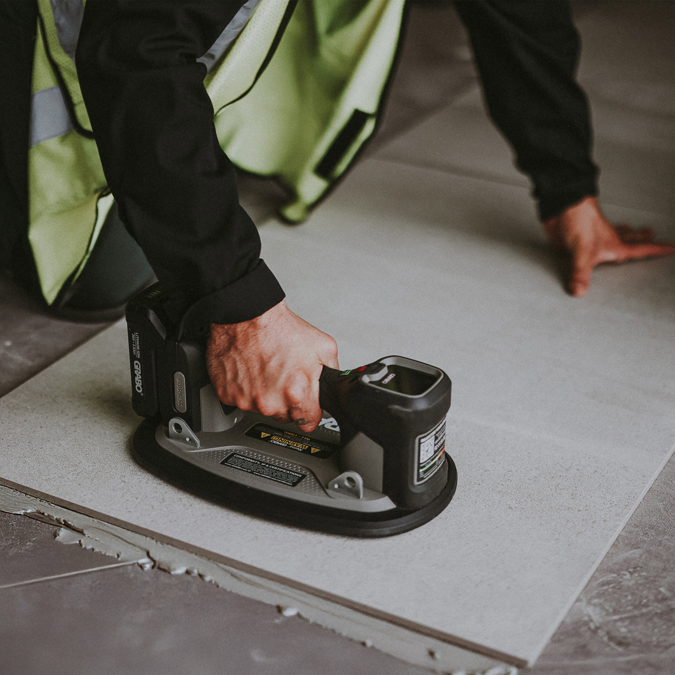 The all-new GRABO® PRO BRUSHLESS is GRABO's most advanced and intelligent vacuum lifter. It features a robust, energy-efficient brushless motor, part of the new 20V battery platform (18V in the EU), and comes standard with a 2.5Ah battery. This powerful motor delivers a rapid airflow of 30 liters per minute, achieving a full vacuum in just 5 seconds.